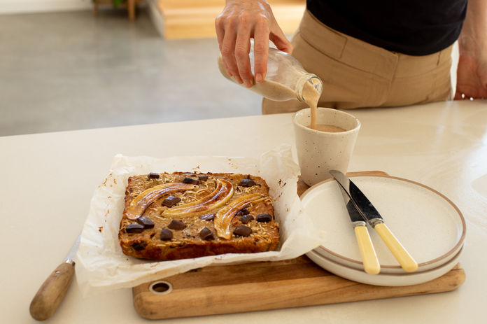 Pour into a square 20cm cake tin.